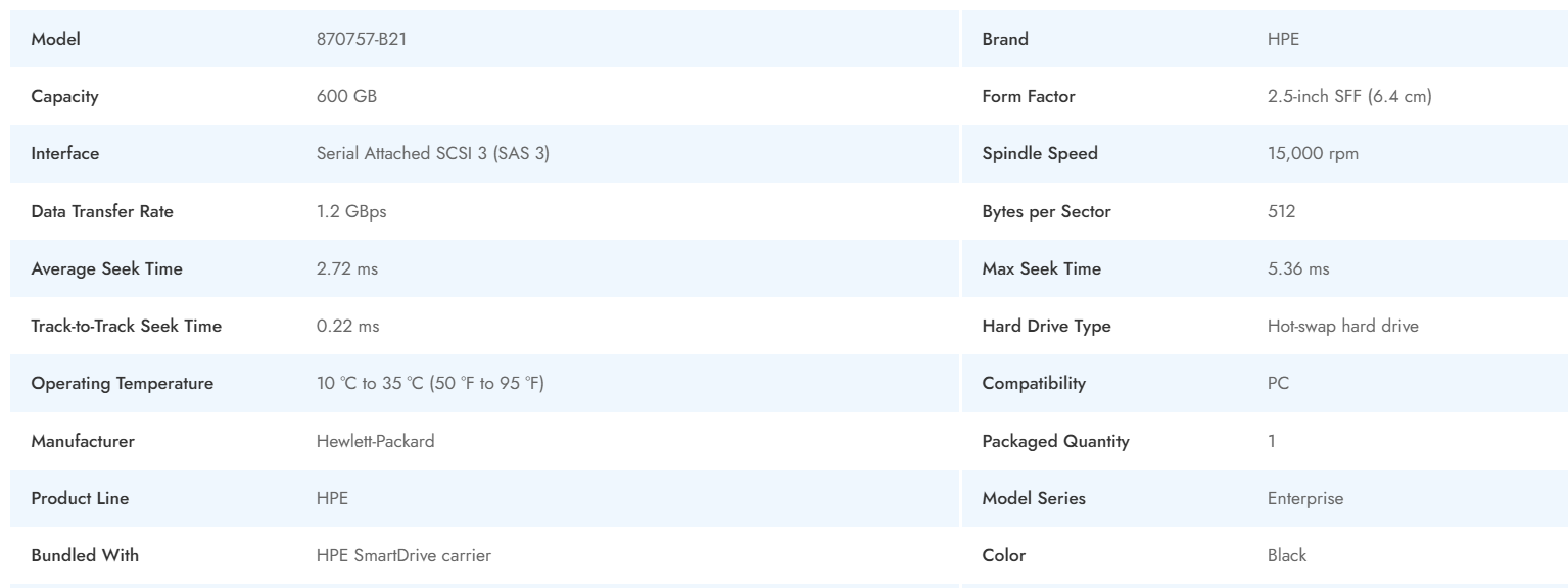 هارد دیسک HPE 870757-B21 یک هارد سروری ۶۰۰ گیگابایتی SAS با سرعت ۱۵٬۰۰۰ دور در دقیقه (15K) و فرمفکتور SFF 2.5 اینچی است که در رده سازمانی (Enterprise) قرار میگیرد و برای ارائه راهکارهای ذخیرهسازی پرسرعت در محیطهای دادهای سنگین طراحی شده است. این هارد سرور از برند HPE از نظر کارایی و قابلیت اطمینان عملکردی ممتاز دارد و با ظرفیت ۶۰۰ گیگابایت و سرعت چرخش بالا، گزینهای ایدهآل برای سرورهای سازمانی و دیتاسنترها محسوب میشود.