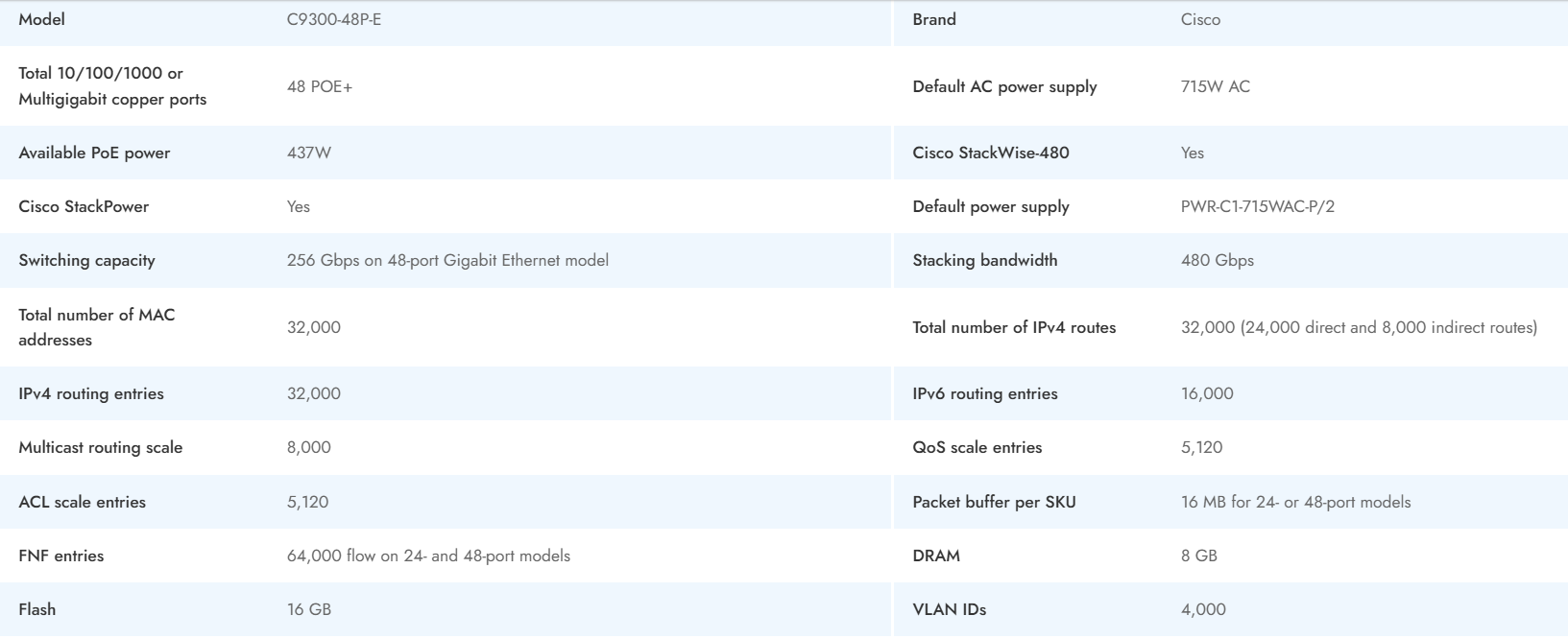C9300-48P-E از Cisco Catalyst یک سوییچ کلاس سازمانی است که بهطور ویژه برای استقرارهای شبکه با عملکرد بالا، مقیاسپذیری و امنیت طراحی شده است. این مدل با بهرهگیری از تکنولوژیهای پیشرفته، پشتیبانی قوی از Power over Ethernet Plus (PoE+) را از طریق 48 پورت گیگابیت مسی فراهم میکند، که برای تأمین انرژی دستگاههای دسترسی نسل آینده، تلفنهای IP و ایستگاههای IoT ایدهآل است.