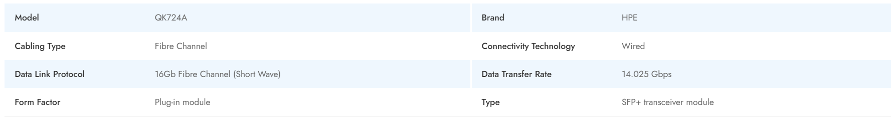 ترنسیور QK724A به‌صورت یکپارچه با زیرساخت‌های HPE سازگار است و انتقال داده‌ای روان و پایدار همراه با افزایش کیفیت اتصال شبکه را تضمین می‌کند. این محصول با ارائه سازگاری بالا و عملکرد ممتاز، به یکی از اجزای کلیدی در معماری شبکه‌های سازمانی (Enterprise) تبدیل شده است.