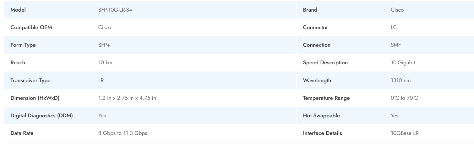 SFP-10G-LR-S=, Cisco 10G SFP+ Module, 10GBASE-LR/SMF/1310nm